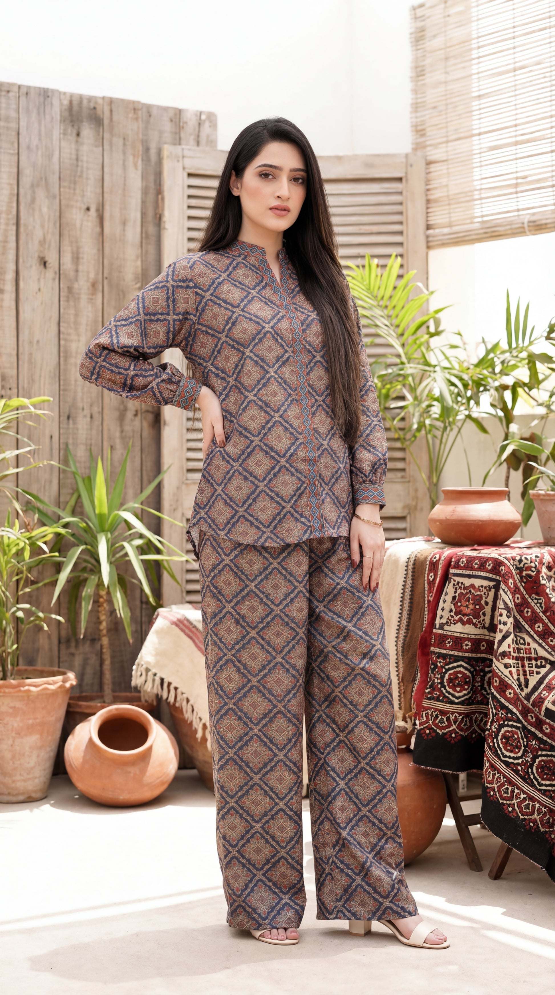 Refined Bohemian Elegance Embrace a rich, earthy palette with our Desert Rose Co-ord Set. This ensemble features an intricate geometric trellis pattern, blending deep olive greens with warm terracotta and mustard tones for a look that is both grounded and sophisticated.